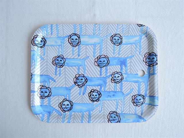 デザイン:mina perhonenのlook木製トレイです。カラーはホワイトベースにライトグレー・ブラック・ブルー・淡いピンクでライオンの総柄デザインです。