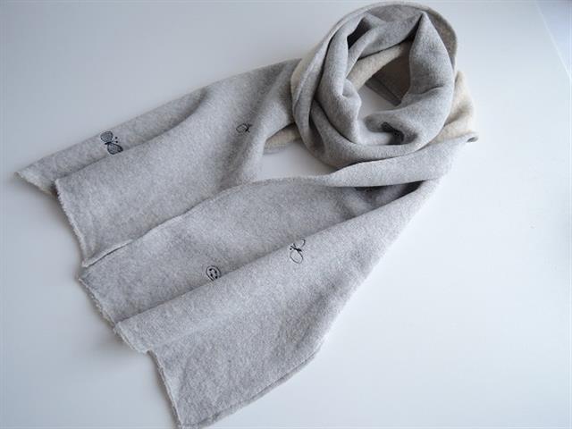 デザイン:mina perhonenのchoucho 刺繍スウェットマフラーです。カラーは杢グレーで、スウェット素材であしらわれており、裏側はベージュの起毛素材です。濃ネイビーの蝶の刺繍が施され、両端は裁ち切りデザインです。
