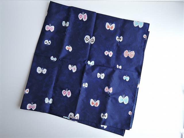 デザイン:mina perhonenのhana hane風呂敷です。カラーは濃淡のあるネイビー地に、アイボリー・ピンク・水色・オレンジ・ダークブラウンで、蝶々が描かれたデザインです。さらりとした少し張りのある肌触りです。