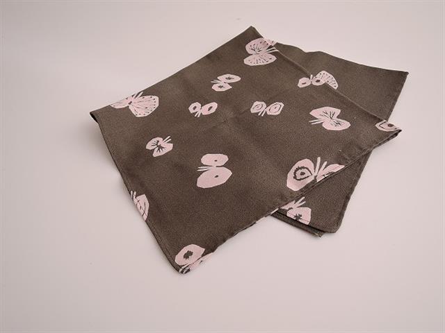 デザイン:mina perhonen×musubiのhana hane風呂敷 小です。カラーはグレー×薄ピンクの蝶々模様で、裏面は黄緑×薄ピンクになっています。