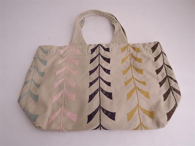 デザイン:mina perhonenのherringbone パニーニバッグ大です。カラーはベージュで、サックス、ピンク、パープル、マスタード、ブラウンの刺繍が施されています。内側にはグレーの裏地とオープンポケット2つ付きで、開口部にはピンクの蝶刺繍が施された裏地と共布の蓋カバー付きです。素材は表地、刺繍が綿100%,裏地が麻100%です。(掲載写真は、実商品のカラーにできるだけ近づけるよう努力はしておりますが、お使いのモニターや画面設定等によっては、色が異なって見える場合もございますので、予めご了承下さい)
