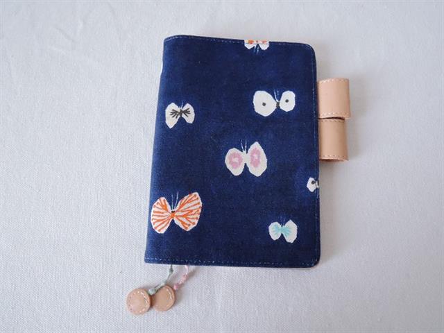 デザイン:mina perhonen×HOBONICHIのhana hane手帳カバーです。カラーはムラのあるネイビー地にアイボリー・オレンジ・ピンク・水色・ダーウブラウンの蝶々のデザインです。内側はベージュで、ポケットが3つ、カード入れが6つ、ブックマークが2本、ペン挿しが1つございます。