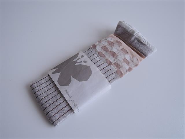 デザイン:mina perhonenのmerci ニーハイソックスです。カラーはライトグレーで、薄いブラウンのストライプ織りです。上部はベージュ・ライトグレーベージュ・薄ブラウン等のドット模様が施されたシースルー地に切り替えられています。