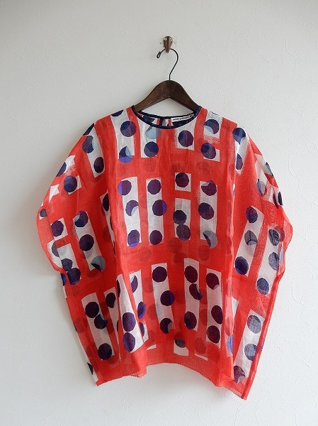 デザイン:2017年春夏コレクション mina perhonen 「domino」のリネン布帛ワイドプルオーバーです。カラーはレッド×ネイビー×ホワイトなどで、シャリ感&透け感のある薄手の麻生地です。背部のドロップホールはボタン&ループ留めで、ネックはパイピング始末、袖口と裾は千鳥篝で施されております。前裾は、アーチカットで少し短いデザインです。定価は36,720円の商品です。 (掲載写真は、実商品のカラーにできるだけ近づけるよう努力はしておりますが、お使いのモニターや画面設定等によっては、色が異なって見える場合もございますので、予めご了承下さい)