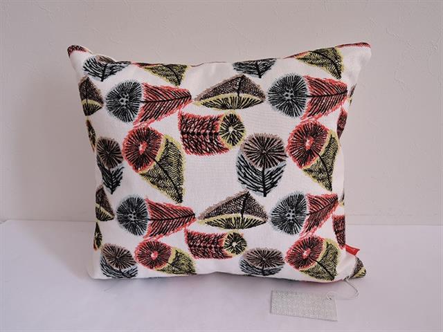 デザイン:mina perhonen×kvadratのhana no miスクエアクッションです。カラーはオフホワイト地にブラック・イエロー・朱色・水色・薄ブラウンで刺繍が施されたデザインです。ファスナー開閉で、カバーの取り外しが可能です。