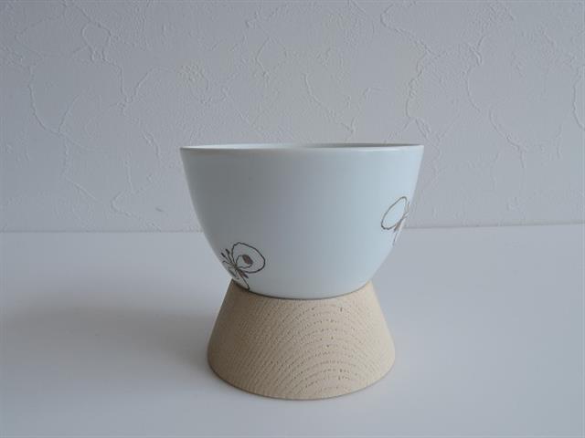 デザイン:mina perhonenのchoucho fuフ 湯のみです。カラーはホワイトで、ブラウングレーの蝶々が描かれており、底が丸くなったデザインで台座とセットでご使用頂くお品です。台座はナチュラルカラーのウッドが使用されています。