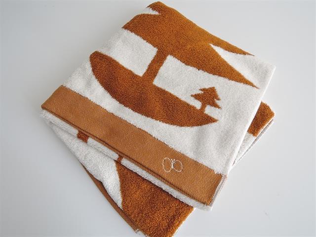 デザイン:mina perhonenのmori no umiバスタオル大です。カラーは濃い黄土色×アイボリーで、素材は綿100%で、厚手のお品です。