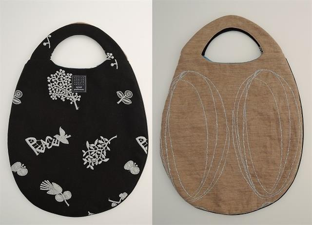 デザイン:mina perhonenのmemory dream エッグバッグです。カラーはブラック地にライトグレーの刺繍の施された「forest parade」と、ブラウン地に グレーの刺繍の「light hole」テキスタイルのデザインです。ブラックの合皮パイピングが施され、光沢のあるブルーの裏地付きです。