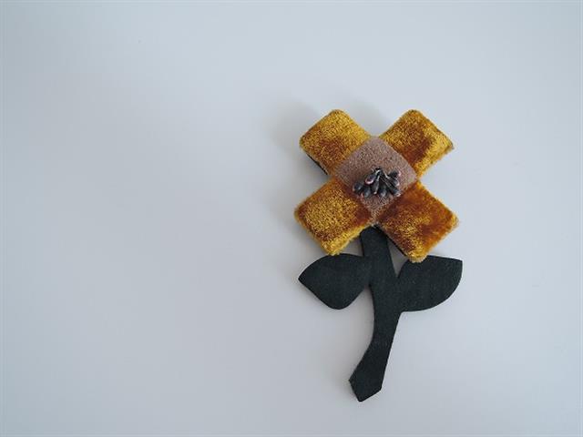 デザイン:mina perhonenのwinter jelly お花ブローチです。カラーはダークグリーンのスウェード調素材と、黄土×ベージュのベロアのような毛足の長い生地の組み合わせで、お花中央部分には、ネオンピンクで色付けされたダークグレーの軸があしらわれています。裏側はグレーミックスのフェルト生地です。