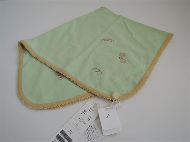 デザイン:mina perhonenのベビーおくるみです。カラーは淡いグリーンで、オレンジで蝶々の刺繍が施されたデザインです。ふち周りはベージュのトリミングがあしらわれており、裏側は生成りベージュです。素材は表生地がコットン100%、裏生地がコットン85%・麻15%です。
