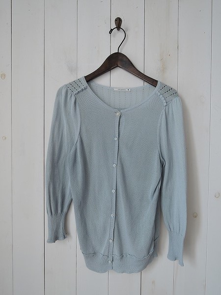 デザイン:mina perhonen 「canaria」のコットンカーディガンです。カラーはくすんだ水色で、フロントボタン開き、背上部に透かし編みが施されております。 (掲載写真は、実商品のカラーにできるだけ近づけるよう努力はしておりますが、お使いのモニターや画面設定等によっては、色が異なって見える場合もございますので、予めご了承下さい)