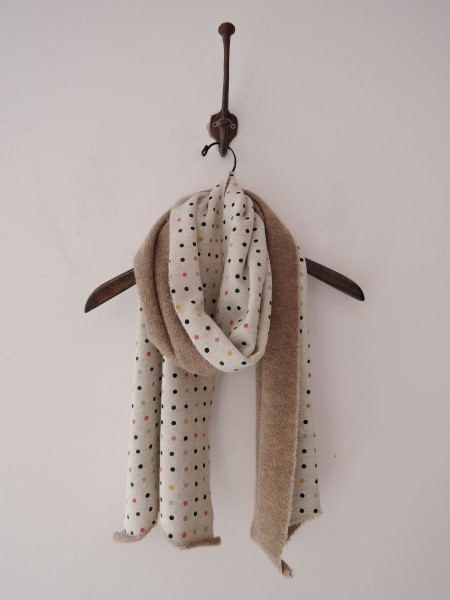 デザイン:mina perhonenのドット柄ストールです。カラーはライトベージュとグレーのMIX地にブラック・イエロー・ピンク等のカラフルなドットがプリントされたデザインで、裏側ははブラウンベージュの起毛であしらわれています。