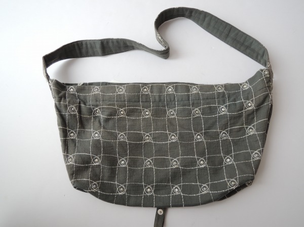 デザイン:mina perhonenのcantuccioシリーズのボディバッグ小です。カラーはダークグレーベースに、ライトグレー・オフホワイトなどで刺繍が全面に施されており、持ち手は2way仕様のデザインです。開口部はファスナーで、内側にはライトベージュの裏地と、ポケットが1つ付いています。素材は表生地と刺繍部分が綿100%、裏生地はポリエステル100%です。