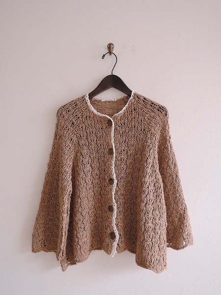 デザイン:mina perhonen「air scape」のニットカーディガンです。カラーはブラウンベージュ×オフホワイトで、透かし編みのニット地であしらわれております。首回りから打ち合わせ部にかけて別布のニットレースが施され、フロントボタンで着脱できます。(掲載写真は、実商品のカラーにできるだけ近づけるよう努力はしておりますが、お使いのモニターや画面設定等によっては、色が異なって見える場合もございますので、予めご了承下さい)