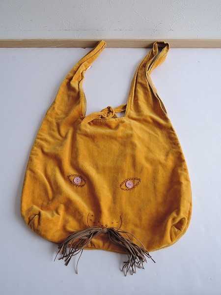 デザイン:mina perhonenのusa bagシリーズのうさバッグ大です。カラーはマスタードの別珍地に、ブラウンの刺繍・ピンクのボタン・ブラウンの紐で、うさぎさんのお顔がデザインされており、持ち手は耳の様にあしらわれています。内側にポケットが1つあり、開口部は結べるようになっています。素材は綿100%です。