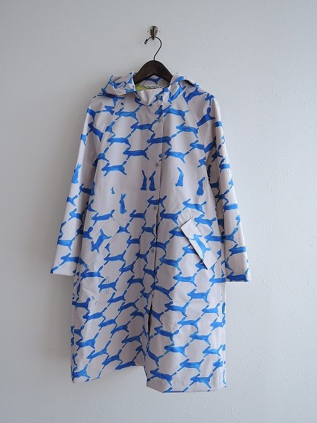 デザイン:mina perhonen 「run run run」の総柄プリントレインコートです。カラーはライトグレーベースで、ムラ感のあるブルーのウサギさんの総柄が施されております。フード付き、フロントはスナップボタン開閉で着脱でき、両腰にフラップポケット付きです。別途共布の収納袋が付属されております。本体価格は38,000円です。(掲載写真は、実商品のカラーにできるだけ近づけるよう努力はしておりますが、お使いのモニターや画面設定等によっては、色が異なって見える場合もございますので、予めご了承下さい)