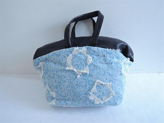 デザイン:mina perhonenのcieloマフィンバッグ大です。カラーはオフホワイト×水色の総柄生地に、ホワイトのペーパー素材が織り込まれたデザインで、持ち手・上部切り替え部分は濃紺のレザーです。開口部はファスナーで、内側にはナチュラルベージュの裏地とポケットが1つ、底板がございます。素材は表生地が綿80%・指定外繊維(ペーパー)20%、裏生地がリネン100%、レザー部分が牛革で、定価は¥33,600です。
