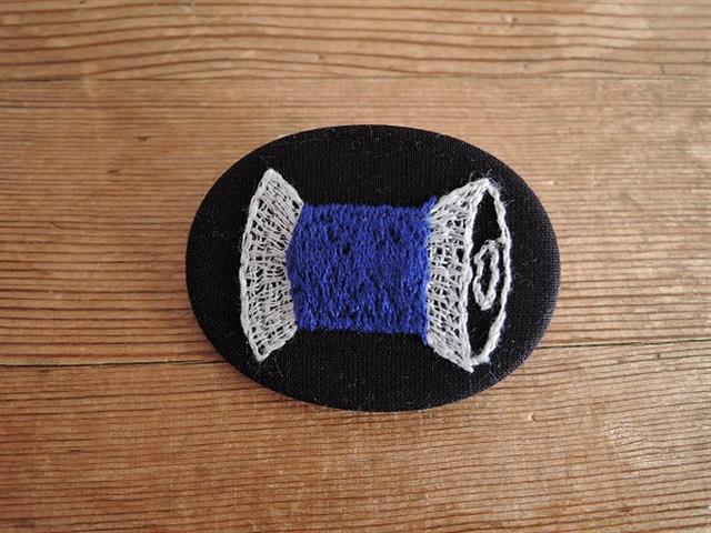 デザイン:mina perhonenのbobbin ブローチです。カラーはブラックベースにブルー×ホワイトの刺繍が施されたデザインです。