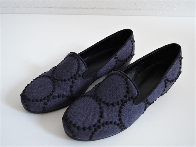 デザイン:mina perhonenのaina スリッポンシューズです。カラーはネイビーで、tambourineのテキスタイルが使用され、履き口にはパイピングが施されております。