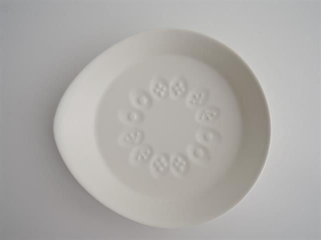 デザイン:mina perhonenのこどものうつわ おさらです。カラーは白で凹凸のある蝶々模様が施されたデザインです。マットな質感のお品です。