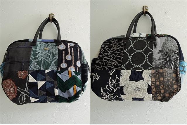 デザイン:mina perhonenのpiece bag ピースバッグです。『pop rain』・『Rosas』・『land theater』・『senko-hanabi』など様々なテキスタイルが使用された贅沢なお品で、持ち手はブラックのレザーです。ブラックの合皮パイピングが施され、開口部はファスナー開き、内側はベージュ系Sleeping Roseのテキスタイル地で、オープンポケット2つ付きです。