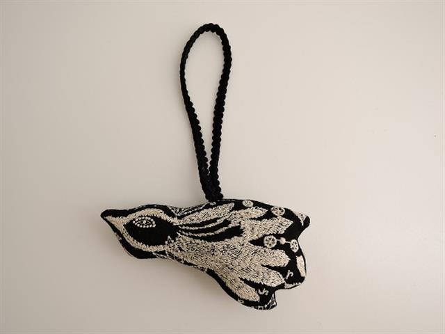 デザイン:mina perhonenのcarnival 刺繍チャームです。カラーはブラック×ライトベージュで、森の鳥を刺繍で描いた贅沢なテキスタイルです。中綿入りになっております。