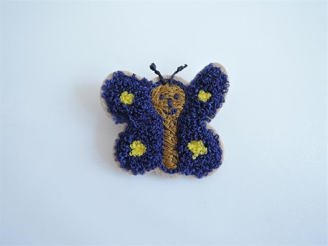 デザイン:mina perhonenのperho-chan ブローチです。カラーはベージュの固めのフェルト地にネイビー・黄土色・イエローで刺繍が施されたデザインです。羽根の部分はパイルのような肌触りです。