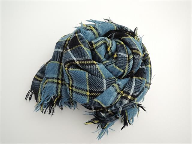 デザイン:mina perhonen×LOCHCARRON OF SCOTLANDのtartan ストールです。カラーはブルー、ネイビー、ホワイト、イエローなどのタータンチェックで、微起毛の織り地で仕立てられています。まわりはフリンジデザインです。
