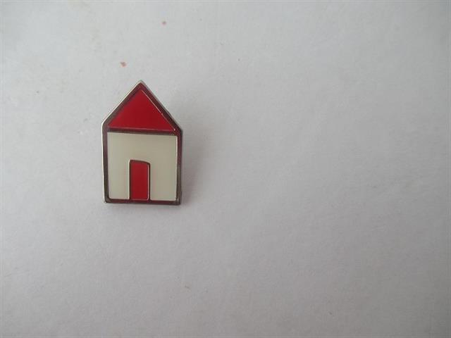 デザイン:mina perhonenのhutte ピンブローチです。カラーは赤×白の小さな家の形をしたブローチです。