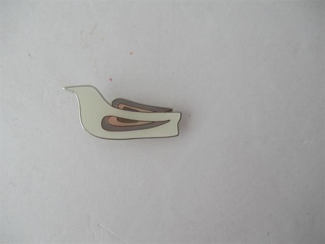 デザイン:mina perhonenのmorning portトリブローチです。カラーは体部分が白で羽部分がグレー、ピンク、茶色になった鳥のブローチです。