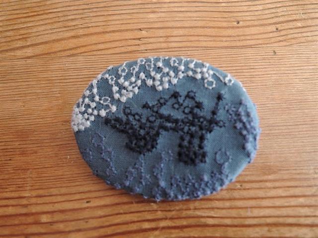 デザイン:mina perhonenの刺繍ブローチです。カラーはネイビー地にグレーブルー×ダークネイビーの刺繍が施されたデザインです。