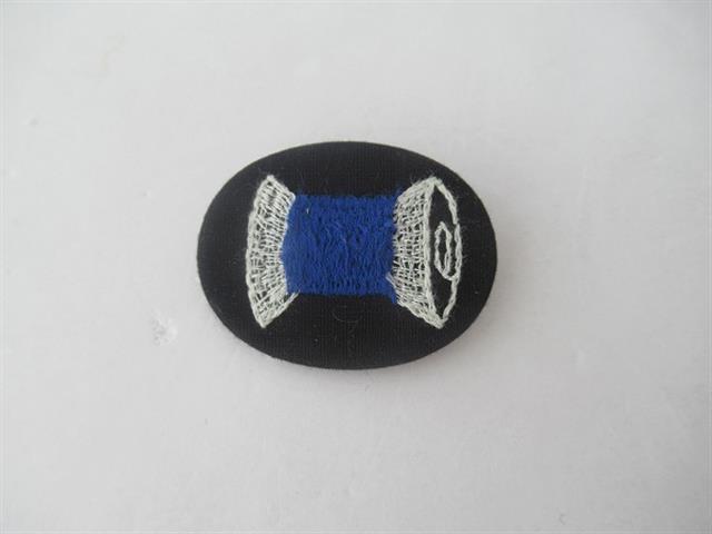 デザイン:mina perhonenのbobbin サンキューベリーバッジです。黒地に刺繍で白いボビンに青い糸が巻かれたデザインです。