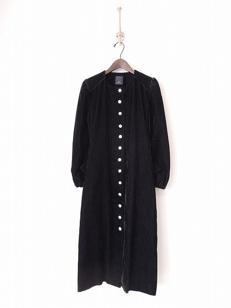 デザイン:mina perhonen 「nocturne」のワンピースです。カラーはブラックで、ベルベット地のストライプ織りお生地であしらわれております。フロントボタンで着脱でき、両腰にポケットがあります。バック腰にベルトが付いていて大きな貝ボタンがアクセントとして付いています。 (掲載写真は、実商品のカラーにできるだけ近づけるよう努力はしておりますが、お使いのモニターや画面設定等によっては、色が異なって見える場合もございますので、予めご了承下さい)