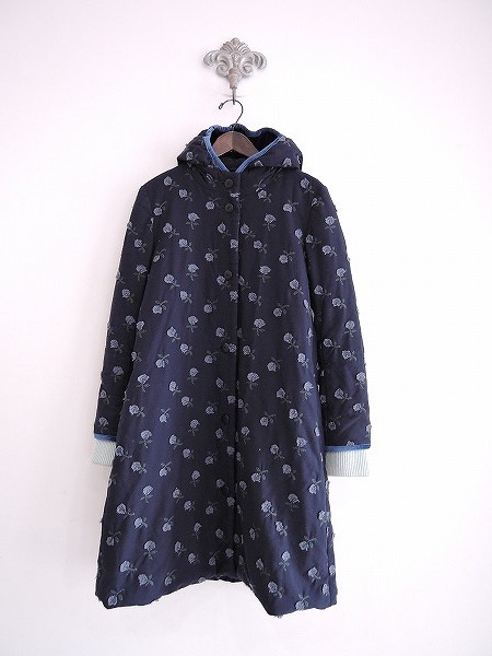 デザイン:mina perhonen 「skip」のダウンコートです。カラーはネイビー地にブルーグレー・ダークグリーンのお花の刺繍が入りの羽毛入り素材であしらわれております。袖口は水色のリブ仕様で、フード周りはブルー、内側にはブラックのベロア生地が施され、フロントボタン開閉です。両腰にポケットがあり、裏地付きで、定価147,000円の商品です。 (掲載写真は、実商品のカラーにできるだけ近づけるよう努力はしておりますが、お使いのモニターや画面設定等によっては、色が異なって見える場合もございますので、予めご了承下さい)