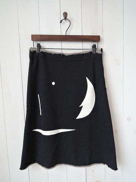 デザイン:mina perhonen「Hiroko」の綿毛スカートです。カラーはチャコールグレー、白い毛羽が織り込まれたやや薄手のスウェット地であしらわれており、内側はミックスベージュになっております。左脇のジッパーで着脱でき、フロントにはホワイトのフロッキープリントが施され、ウエスト部分の生地端は断ち切りになっております。 (掲載写真は、実商品のカラーにできるだけ近づけるよう努力はしておりますが、お使いのモニターや画面設定等によっては、色が異なって見える場合もございますので、予めご了承下さい)