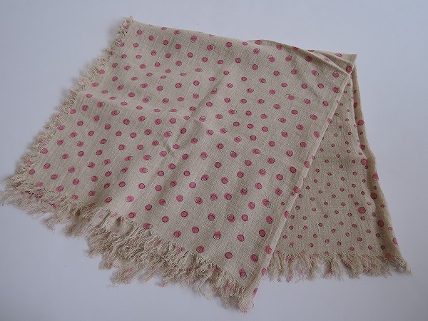 デザイン:mina perhonenのドット柄ストールです。カラーはナチュラルベージュのガーゼの様な生地に、ピンクとチャコールグレーの手書き風のドット柄デザインで、縁周りに裁ち切りのフリンジが施されています。