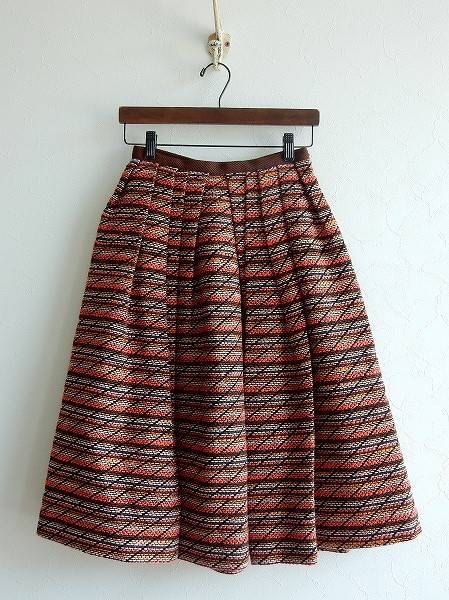 デザイン:mina perhonen 「poppy」のタック入りフレアスカートです。カラーはブラウン×ブラック×朱色×薄いピンク×ブロンズなどのミックスで、微起毛のやや厚手素材であしらわれております。ウエスト部分は別布で、ウエスト周りにはタックが施されております。左腰のホック&ファスナーで着脱でき、裏地付きです。 (掲載写真は、実商品のカラーにできるだけ近づけるよう努力はしておりますが、お使いのモニターや画面設定等によっては、色が異なって見える場合もございますので、予めご了承下さい)
