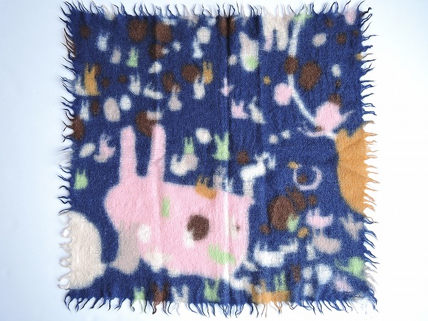 デザイン:mina perhonenのうさぎ柄ストールです。カラーはネイビーベースにピンク・ブラウン・ベージュ等のうさぎの総柄で、縁周りに裁ち切りのフリンジが施されています。