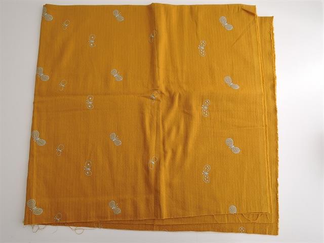 デザイン:mina perhonenのchoucho 生地 size 105cm×120cmです。カラーはマスタードで、ストライプのヘリンボーン生地に、柔らかなガーゼ地が合わせられたダブルクロスです。ライトブルーのchoucho刺繍が表裏共に施されています。