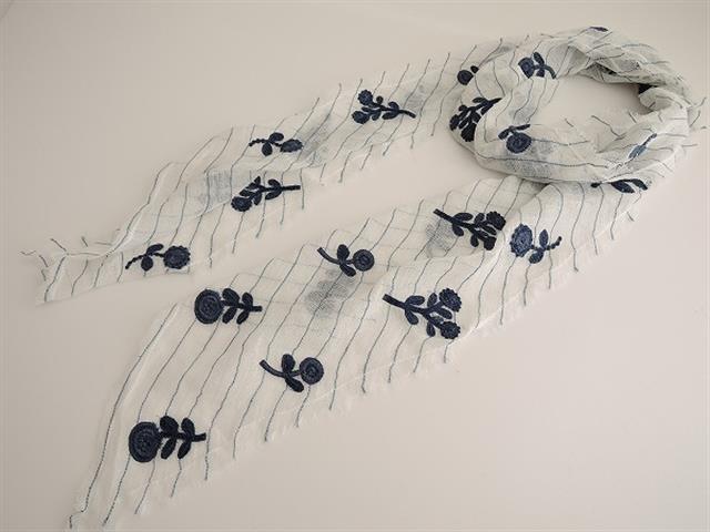 デザイン:mina perhonenのBonheur 刺繍ストールです。カラーはホワイト×ブルーのストライプに、ネイビーのBonheur刺繍が施されたデザインです。透け感のあるガーゼのような薄手地で仕立てられ、まわりは裁ち切りデザインです。品質タグは付いておりませんが、綿素材かと思われます。