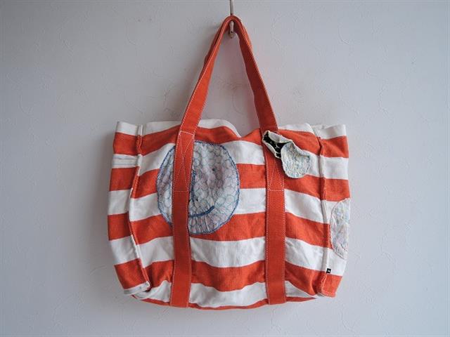デザイン:mina perhonenのリネンキャンバスボーダートートバッグです。カラーはオフホワイト×オレンジで、素材はリネンキャンバスです。ミナペルホネンのテキスタイルに顔が刺繍されたパッチワークが施されたデザインで、表面サイドと内側に1つずつオープンポケットと内側に大きなジッパーポケット付きです。肩掛けにも対応しています。