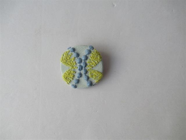 デザイン:mina perhonenの刺繍ブローチです。カラーはライトブルー、ブルー、イエローの刺繍のデザインです。
