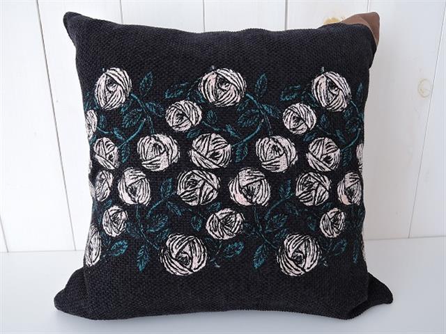 デザイン:2018-19AW/mina perhonenのrosy クッションです。カラーはブラック・ネイビーのミックス織り地に、ブラック・グリーンブルー・淡いピンクでバラの刺繍が施されたデザインで、ファスナー開閉でカバーは取り外しが可能です。内側はブラックの裏地付きです。素材は表生地が毛62%・ポリエステル30%・分類外繊維(紙)8%、刺繍部分が綿39%・アクリル37%・毛24%、別布部分がポリエステル80%・ポリウレタン20%、裏生地が綿100%、インナークッションは側生地がポリエステル100%、中素材がリサイクルダウン50%・リサイクルフェザー50%です。
