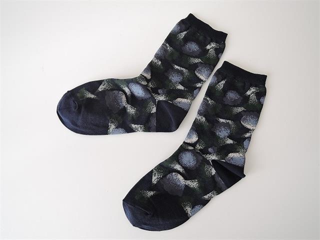 デザイン:mina perhonenのAriel ソックス ネイビーです。カラーは濃紺ベースに暗めグリーン・淡いグリーン・グレー・水色・オフホワイトのお花の総柄デザインです。