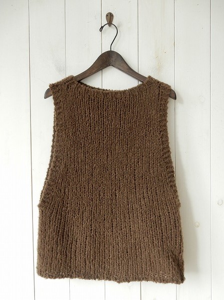 デザイン:mina perhonen「morning mist」のニットベストです。カラーはブラウンで、柔らかな肌触りのローゲージニットであしらわれております。アームホールは開きの大きい広めのデザインです。本体価格38,000円の商品です。 (掲載写真は、実商品のカラーにできるだけ近づけるよう努力はしておりますが、お使いのモニターや画面設定等によっては、色が異なって見える場合もございますので、予めご了承下さい)