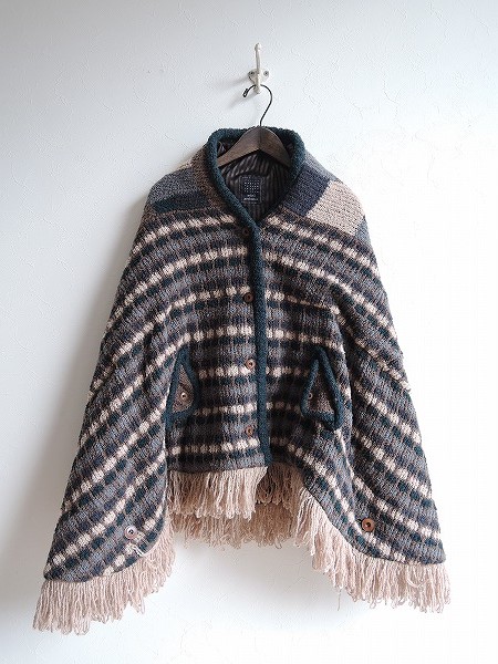 デザイン:mina perhonen「candy block」のダウン入り総柄ニットポンチョです。カラーはベージュ・ブラウン・ダークグリーンなどの総柄で、羽毛入りのニット地であしらわれ、裾に8cm程のフリンジ付きです。フロントボタン開きで、前腰左右のフラップ部分はホールになっており、内側にポケットがございます。裾左右のボタンを留めるとアームホールになるデザインで、裏地付きです。 (掲載写真は、実商品のカラーにできるだけ近づけるよう努力はしておりますが、お使いのモニターや画面設定等によっては、色が異なって見える場合もございますので、予めご了承下さい)