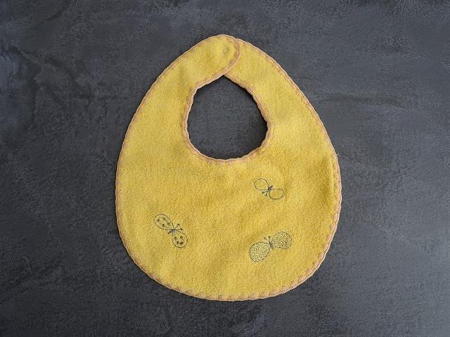 デザイン:mina perhonenのchouchoパイルスタイ イエローです。カラーはイエローのパイル地に、グレーブラウンで蝶々の刺繍が施されたデザインで、パイピング部分はオレンジがかったベージュになっています。素材は綿100%です。