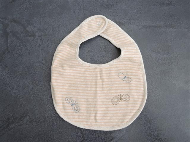 デザイン:mina perhonenのchouchoボーダースタイです。カラーはグレー混じりのライトベージュ地に、オレンジ味を帯びたベージュのボーダー柄で、ブルーグレー・薄ブラウンで蝶々刺繍が施されたデザインです。素材は綿100%です。