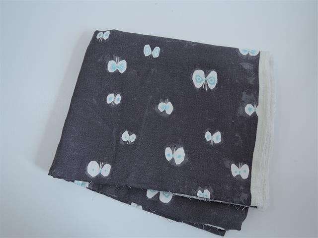 デザイン:mina perhonenのhana hane チョウチョプリント生地です。カラーはムラのあるダークグレーベースで、ホワイト&サックスdでふんわりと舞うちょうちょたちを描いたテキスタイルです。