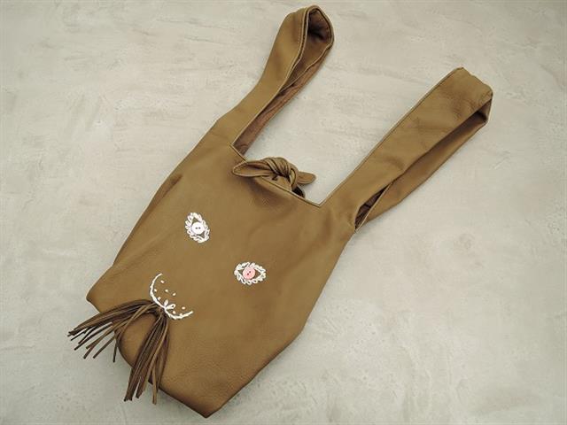 デザイン:mina perhonenのレザーうさバッグです。カラーはカーキで、レザー素材で仕立てられています。ピンクのボタン、ホワイトの刺繍、レザーひげで、ウサギさんの顔がデザインされたアイテムです。開口部はひも結びで、内側に裏地とオープンポケット1つ付きです。表地が牛革(カーフ)、裏地が麻100%です。定価は35700円の商品です。
